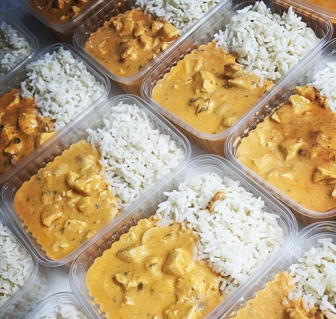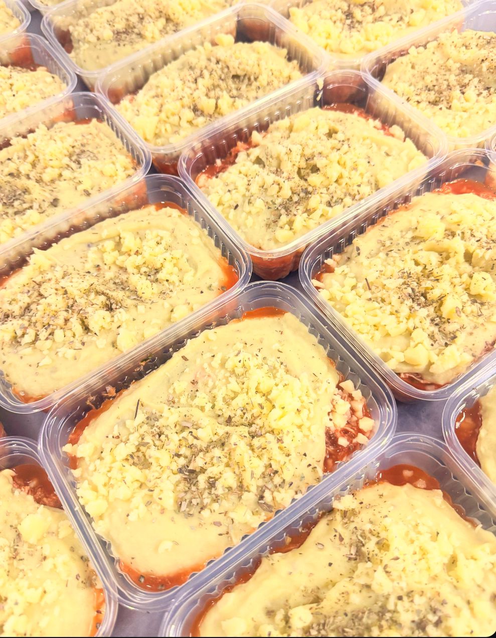 Ensopadinho de legumes, arroz branco e purê de batatas.